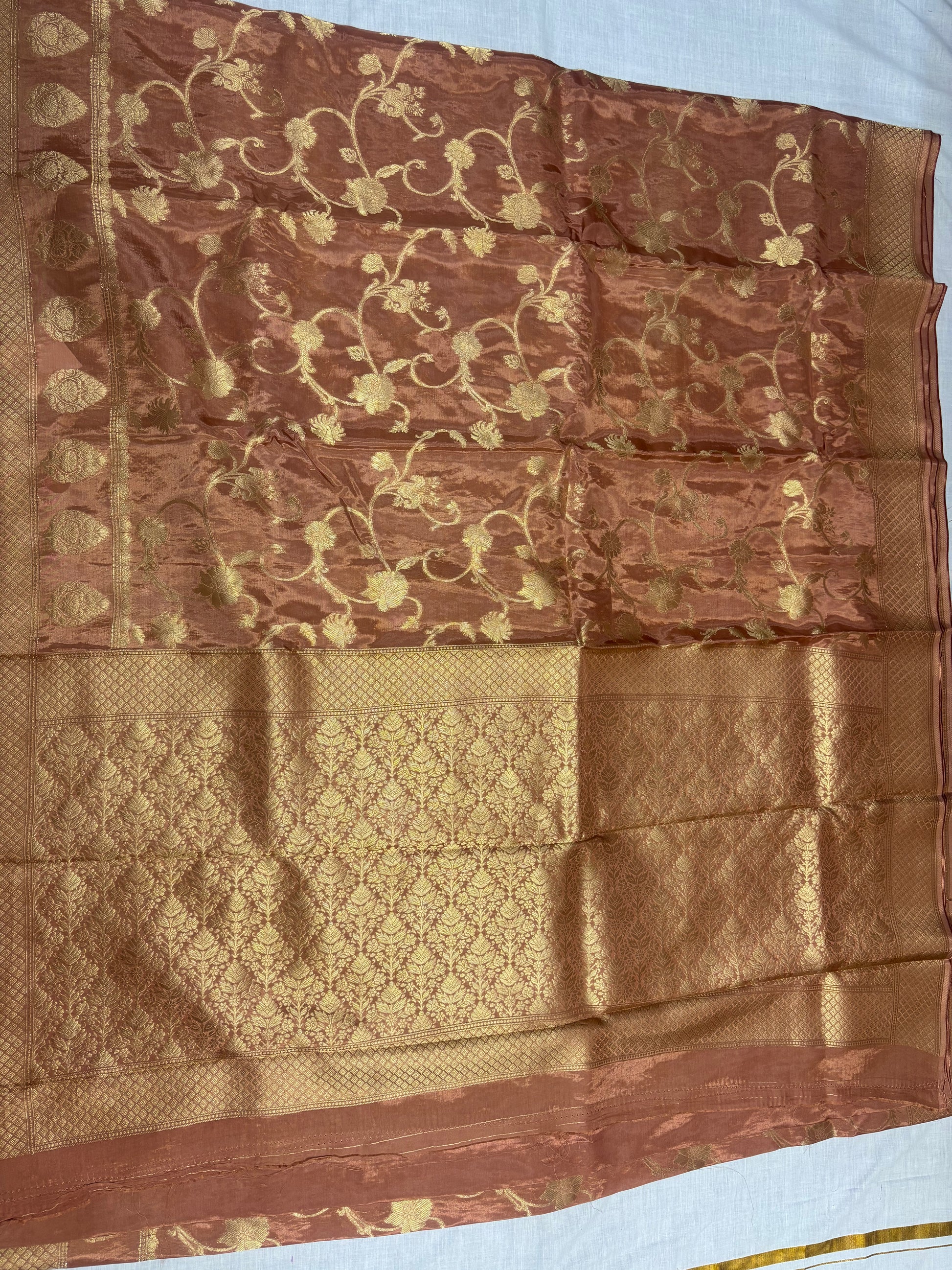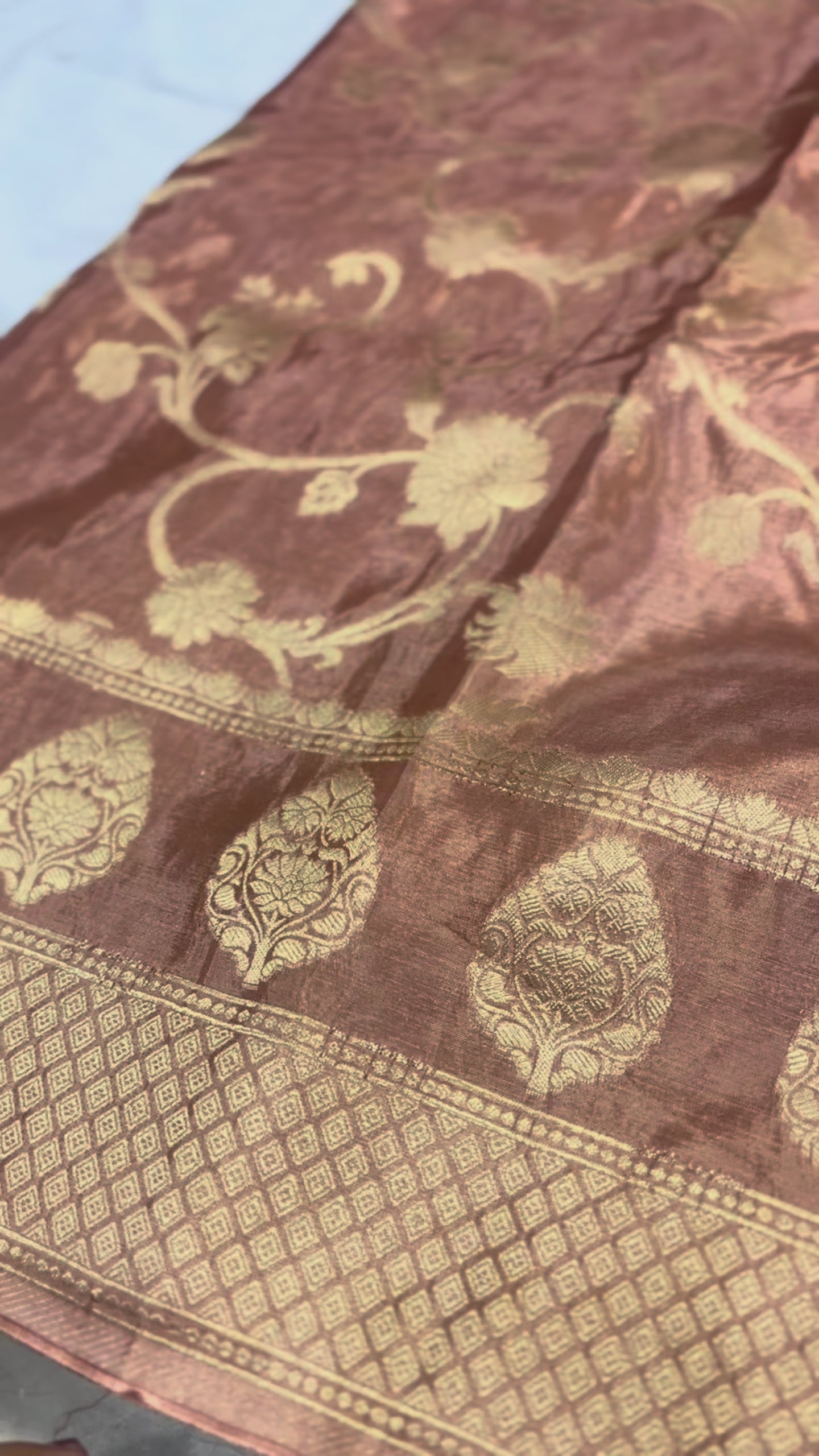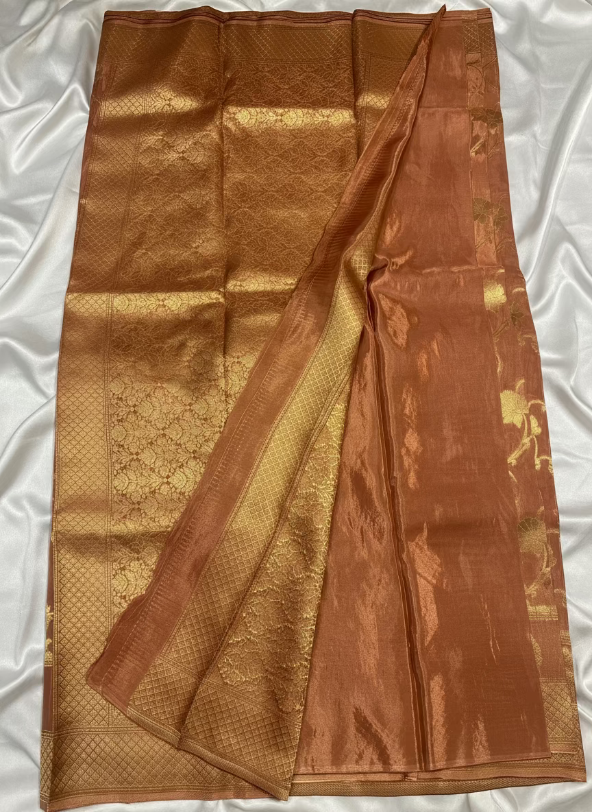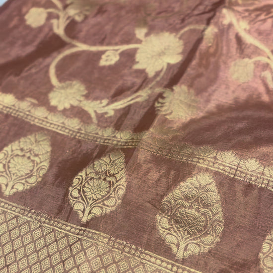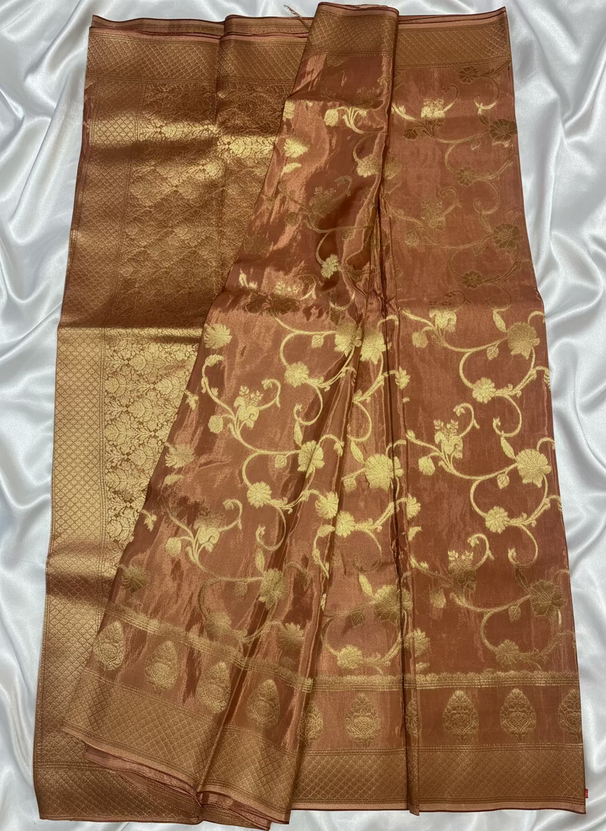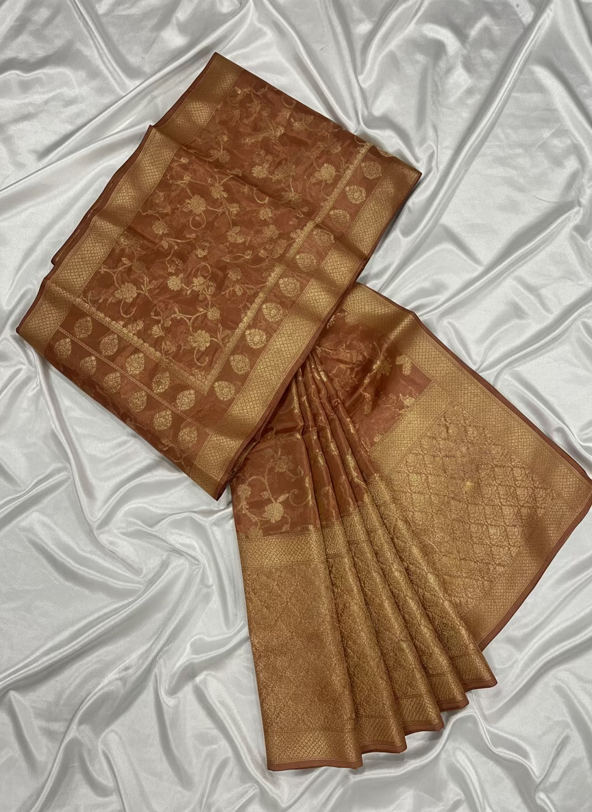 ಸಿಲ್ವರ್ ಜಾಲ್ ವಿನ್ಯಾಸದೊಂದಿಗೆ ಕಂದು ಬನಾರಸಿ ರಷ್ಯನ್ ರೇಷ್ಮೆ ಸೀರೆ - ಡಿಸೈನರ್ ಪಾರ್ಟಿ ವೇರ್