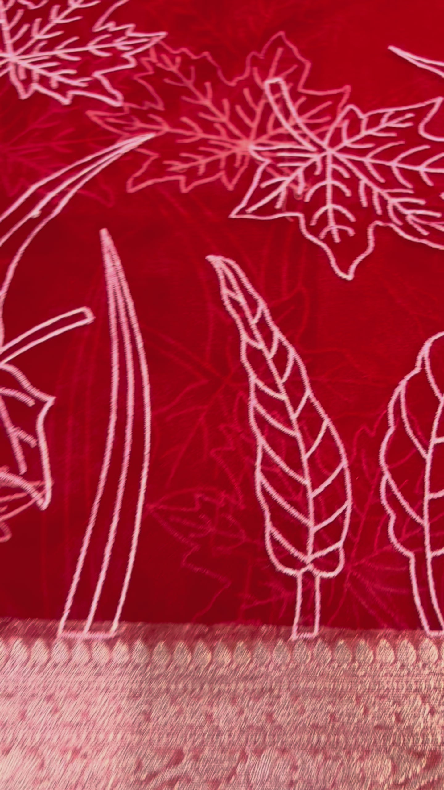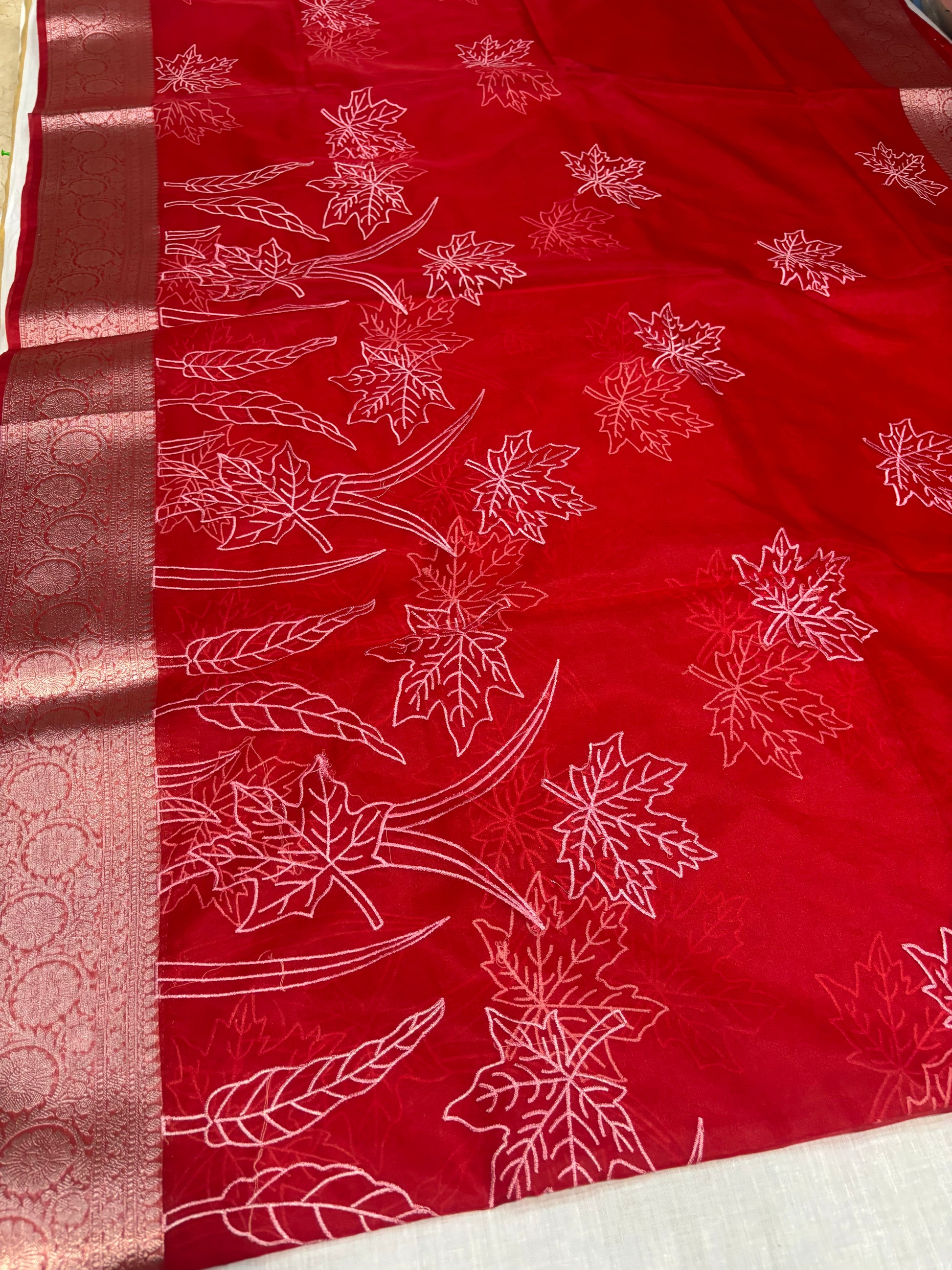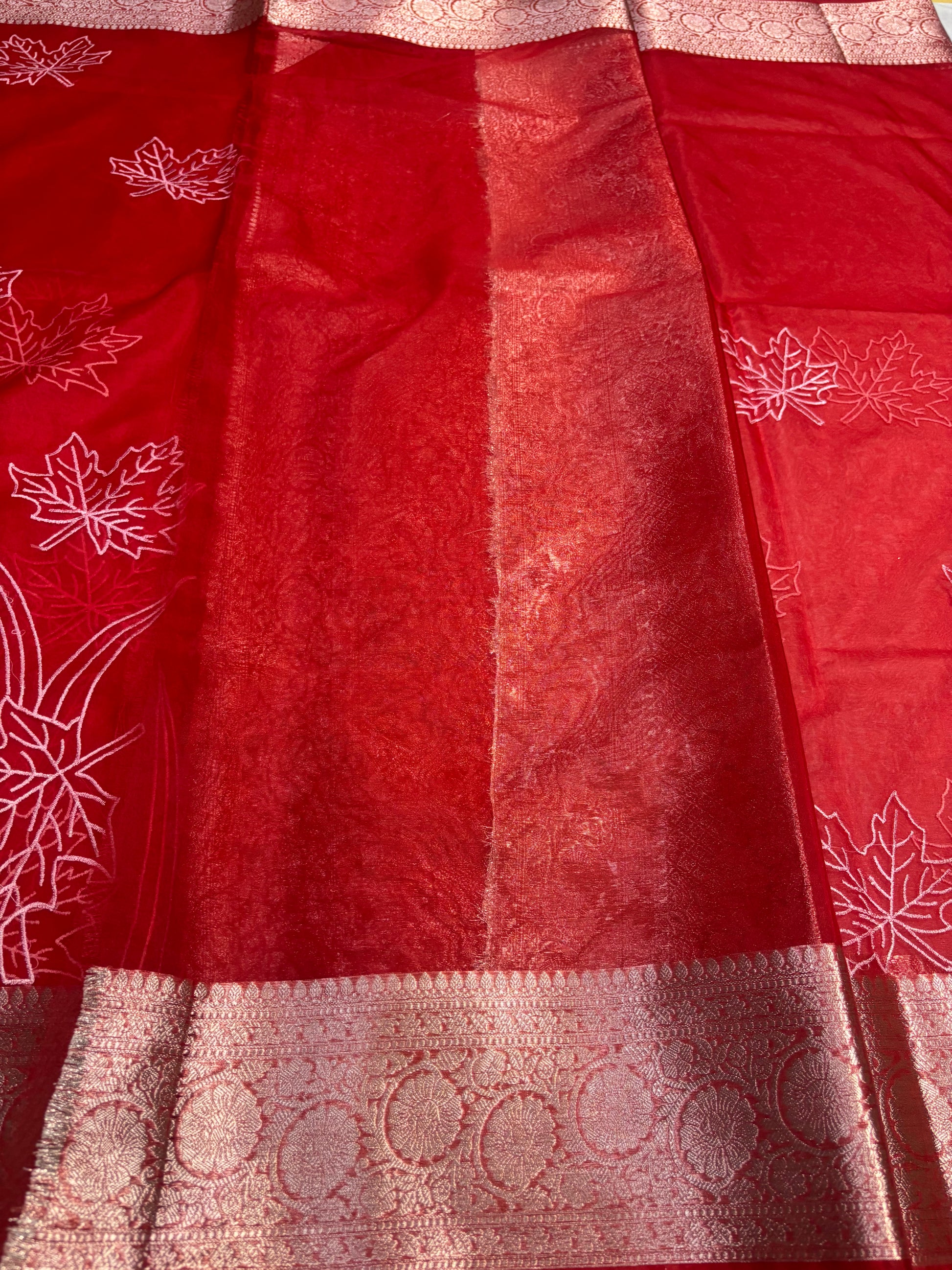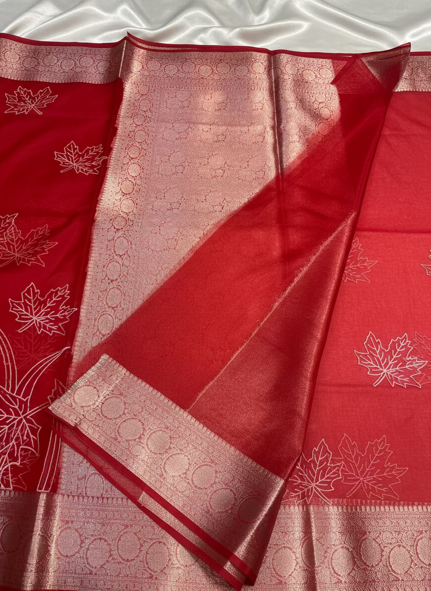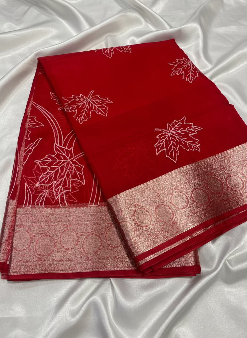 ಬನಾರಸಿ ಕೆಂಪು ಕೋರಾ ಆರ್ಗನ್ಜಾ ಸಿಲ್ಕ್ ಜೊತೆಗೆ ಅಪ್ಲಿಕ್ ಸ್ಫೂರ್ತಿ ಪಡೆದ ಕಸೂತಿ ಸೀರೆ - ಸಾಂಪ್ರದಾಯಿಕ ಉಡುಗೆ