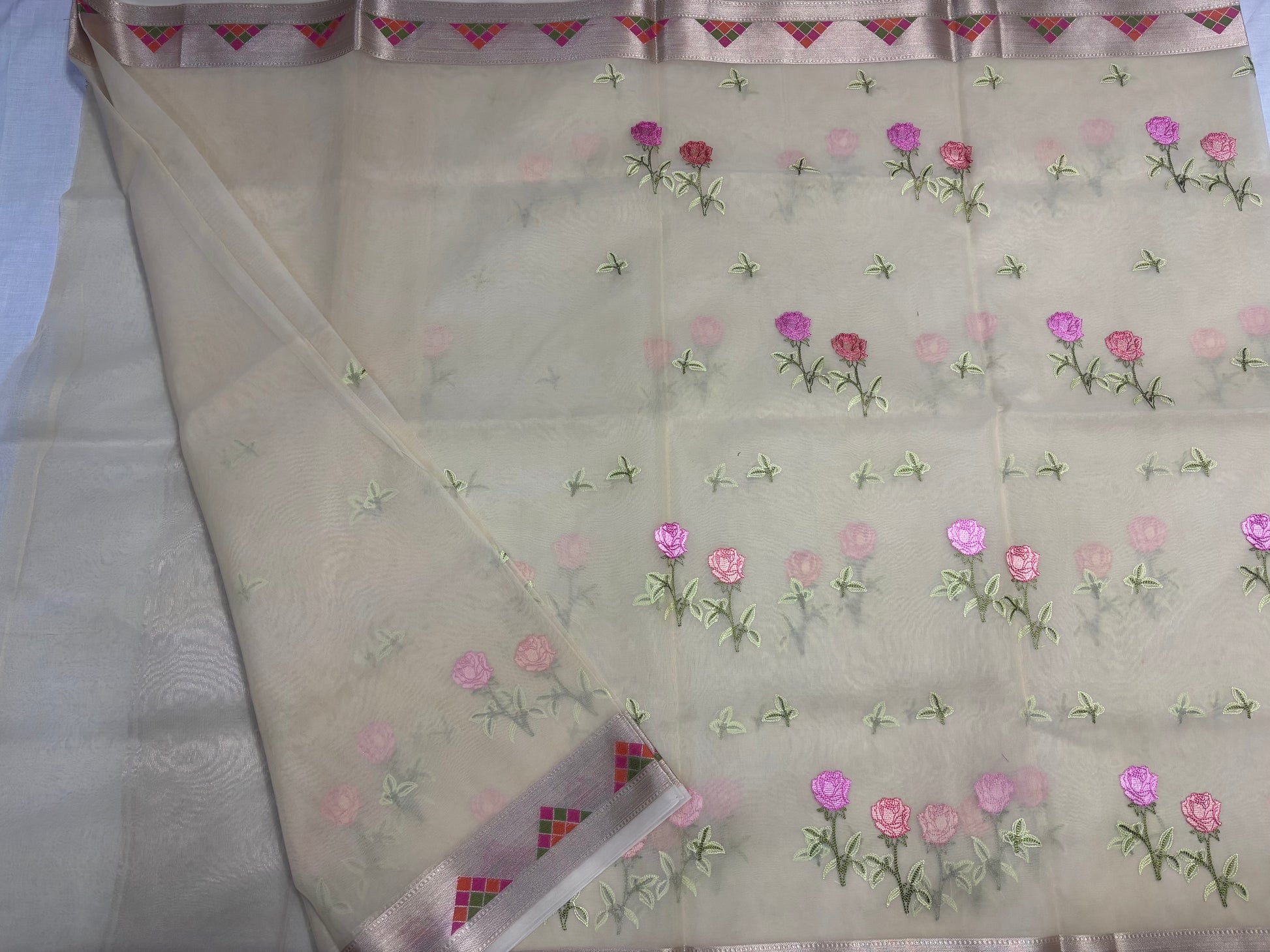 Craft: Rose Chikankari embroidery with Parsi work border
