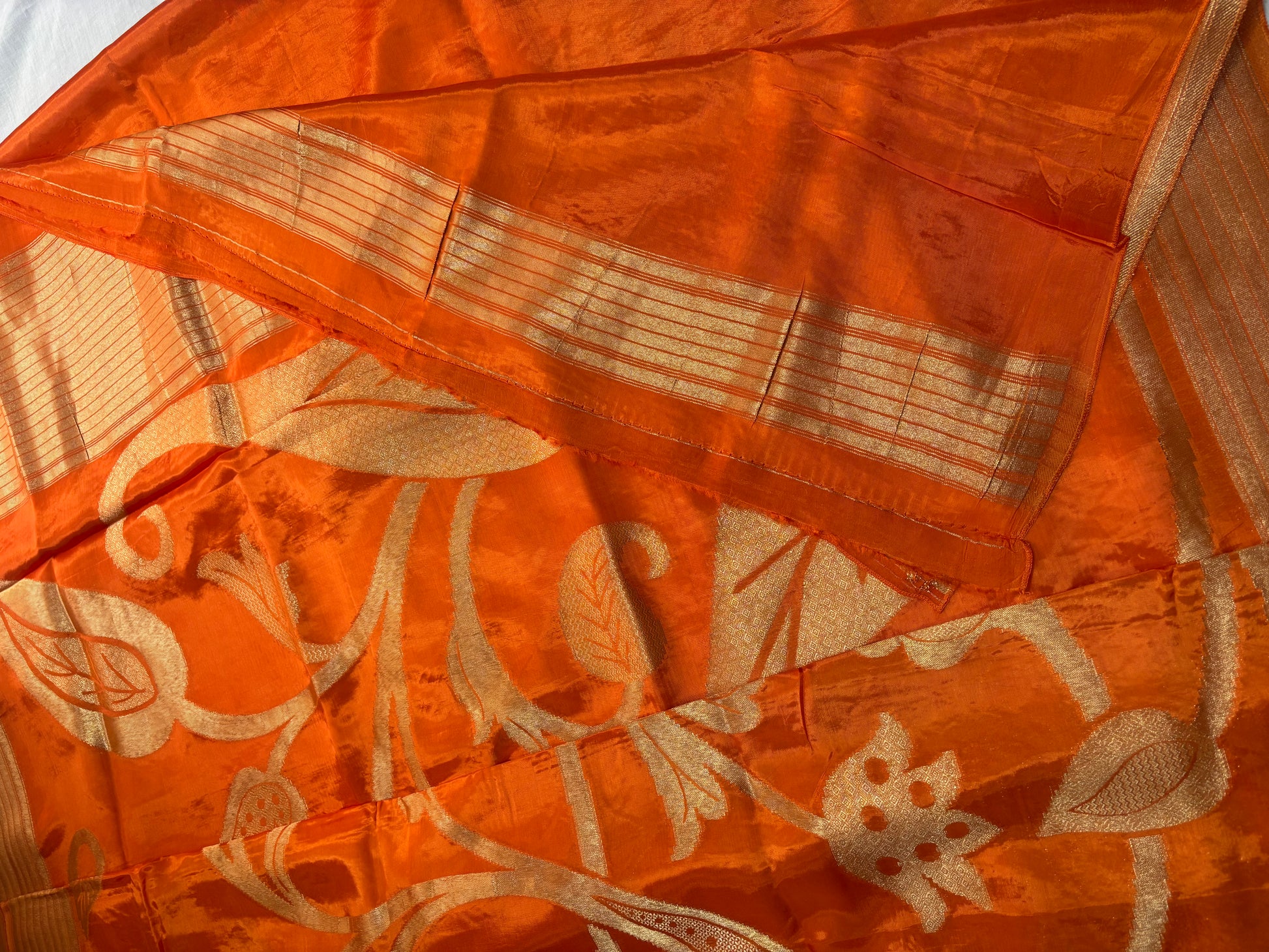 Exclusive Bright Orange Banarasi Mashru Silk Saree is a radiant masterpiece of designer ethnic wear. Featuring big floral patterns across the body and pallu, with gold Zari borders exudes richness and grandeur. The sheen of Mashru silk enhances its elegance, making it perfect for festive and celebratory occasions. A vibrant saree that combines artistry with timeless charm. This fabric has a natural shine and make feather lite drape.