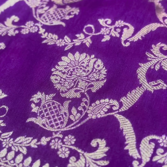 This Purple Banarasi Mashru Satin Saree is a refined blend of tradition and luxury, featuring delicate allover floral Jaal pattern on the silky body. The highlight is its intricately woven border, adding a royal architectural charm to the drape. The Satin fabric adds smooth, lustrous finish perfect for elegant occasions. A statement of timeless sophistication.