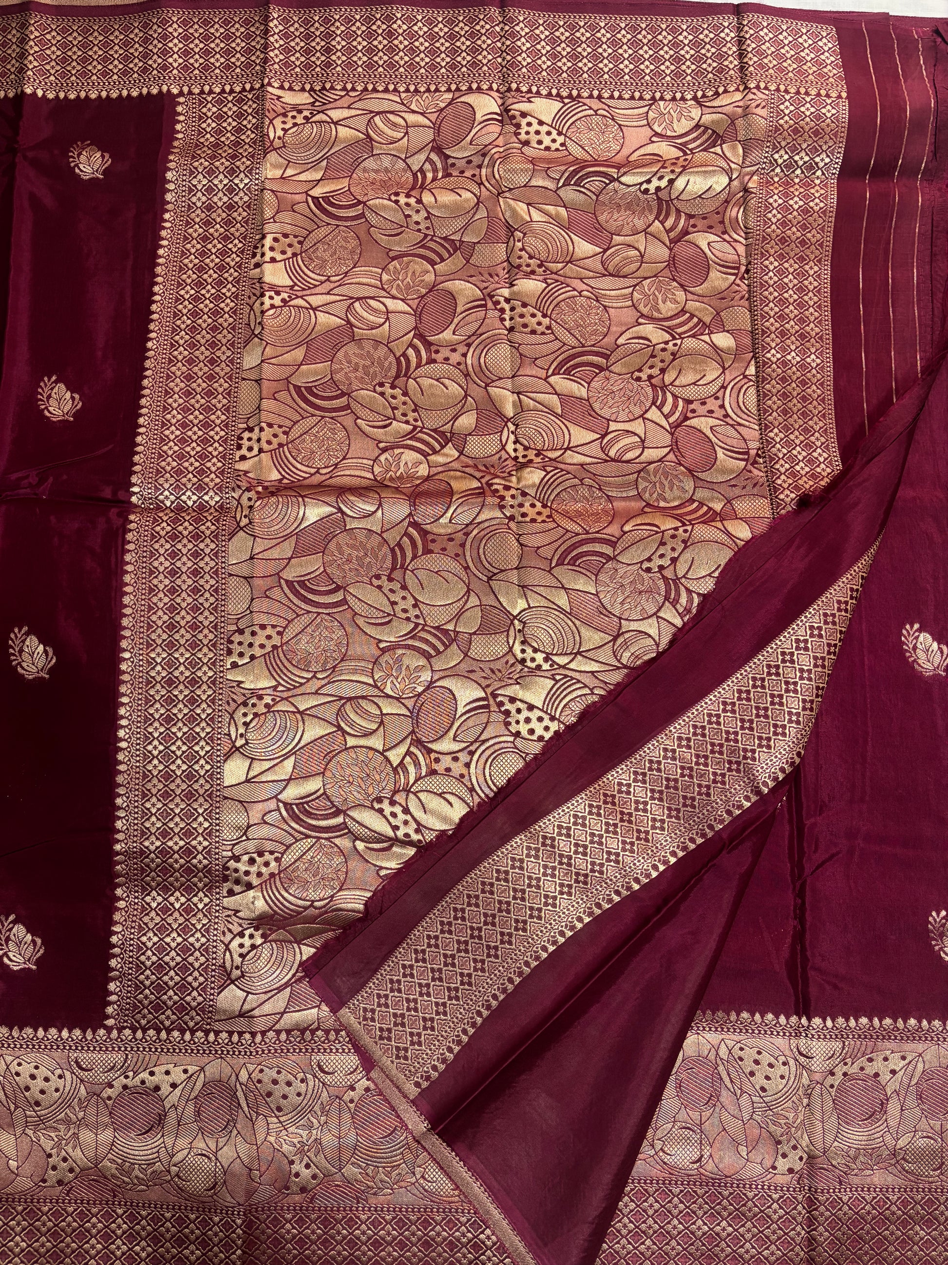 Maroon Banarasi Russian Silk Saree with Light Gold Pallu & Border - Traditional Wear