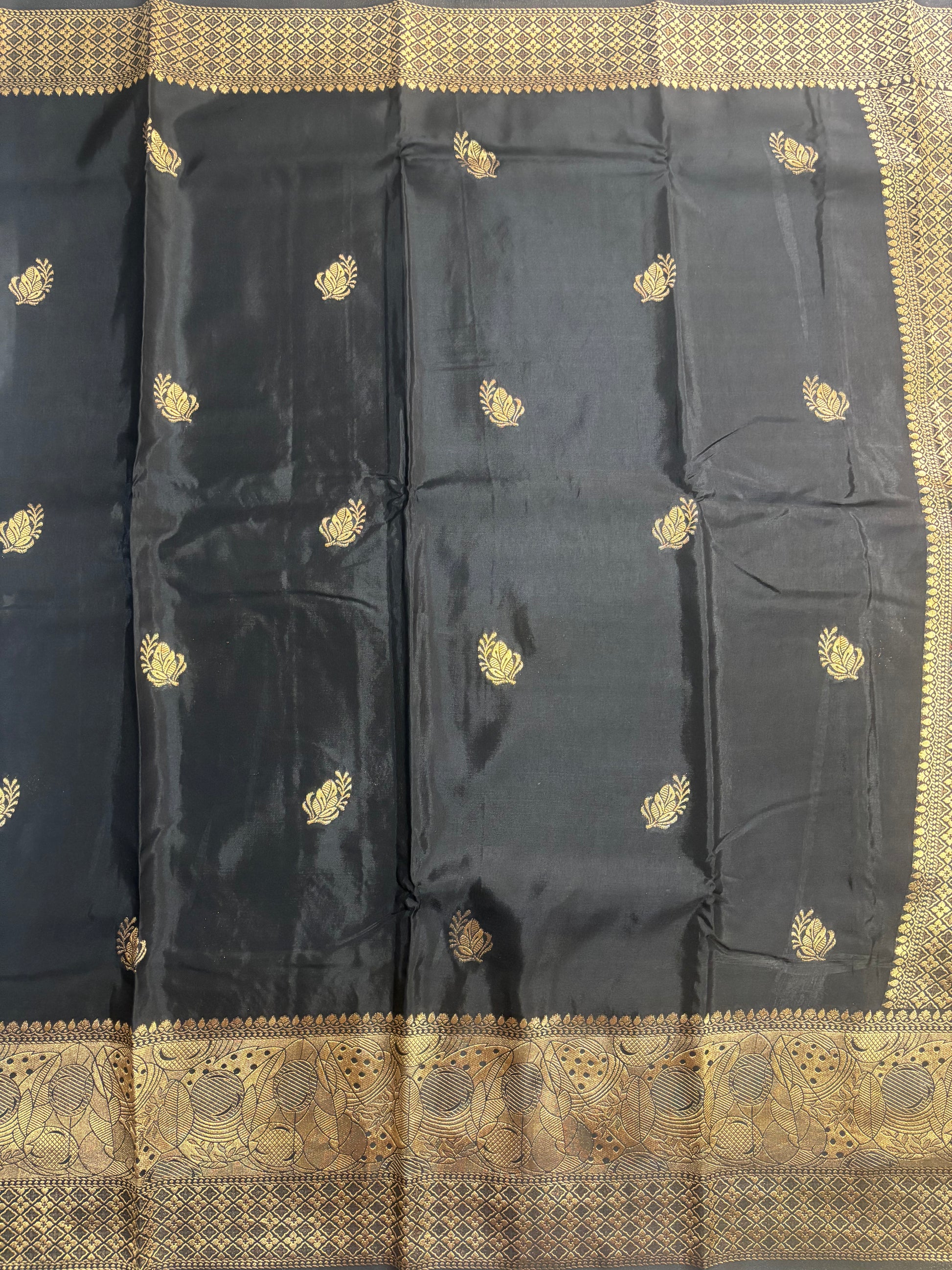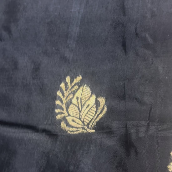 This Black Russian Silk saree has small floral butta design all over the body and drapes beautifully with a soft, smooth texture and a subtle sheen. The light golden woven rich Pallu & Border makes it more luxurious. Lightweight yet rich in appearance, it offers perfect comfort and sophistication for any occasion.