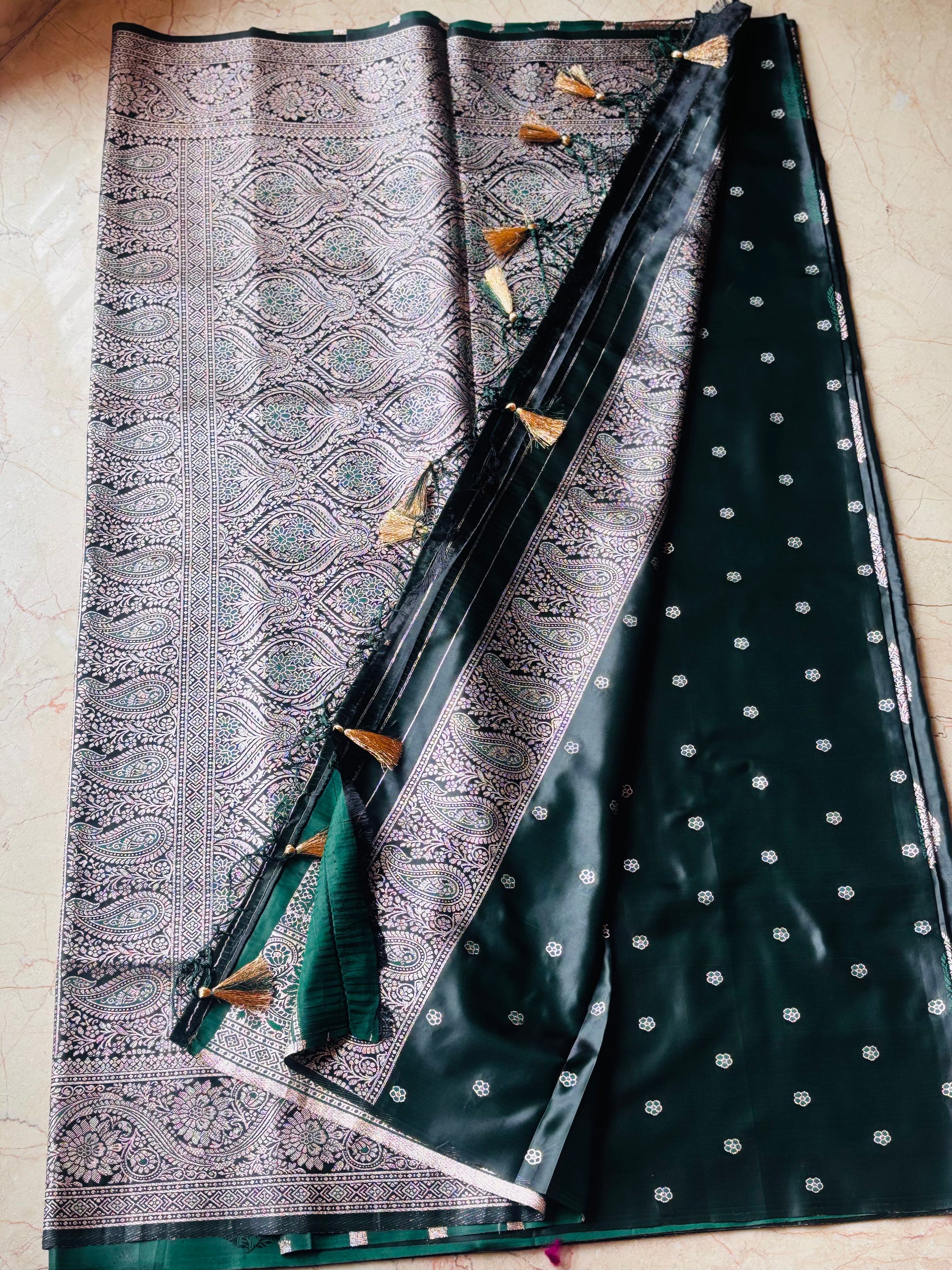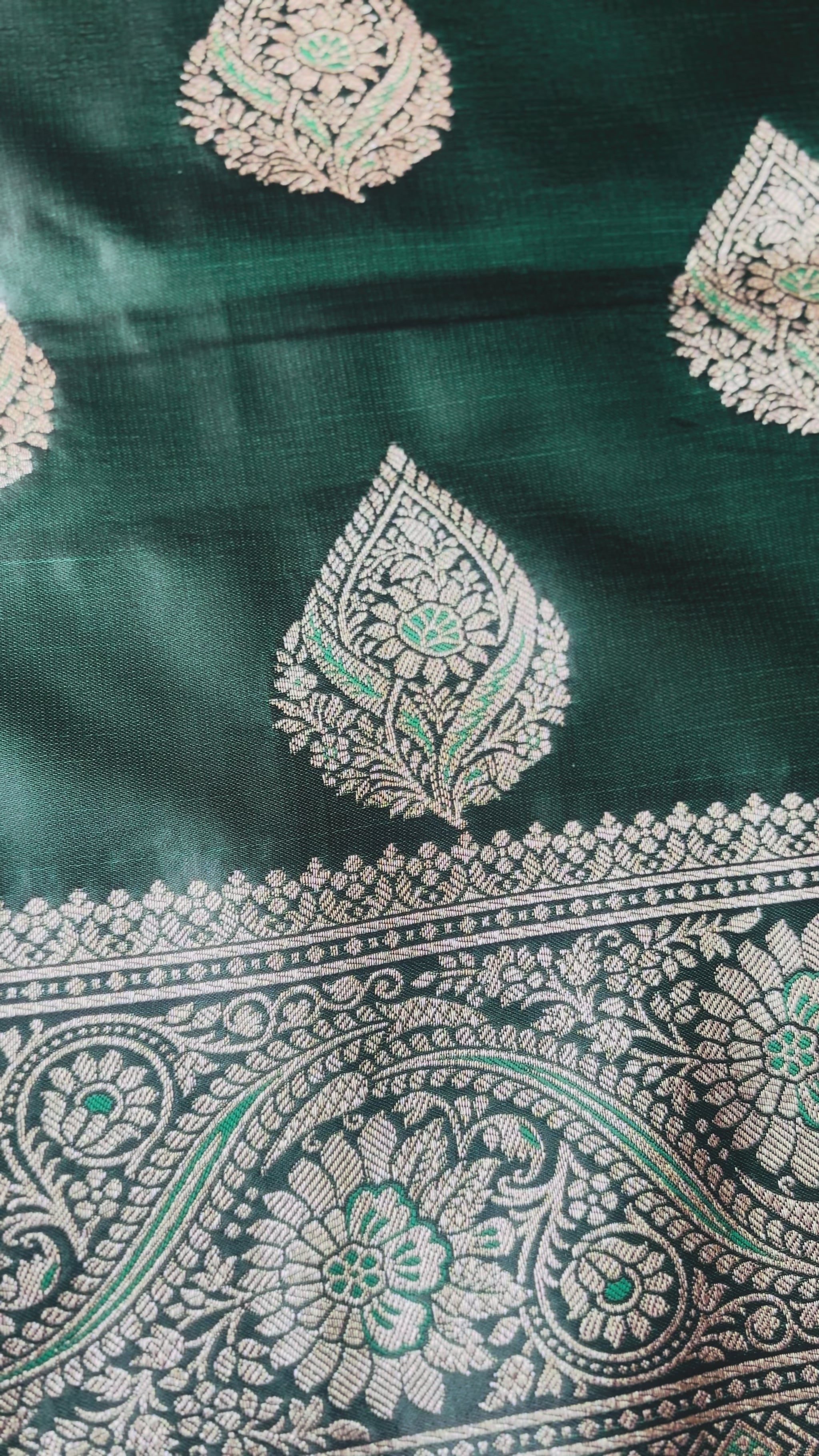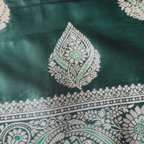 Dark Green Banarasi Pure Mashru Katan Silk with Big Silver Butta - Designer Traditional wear