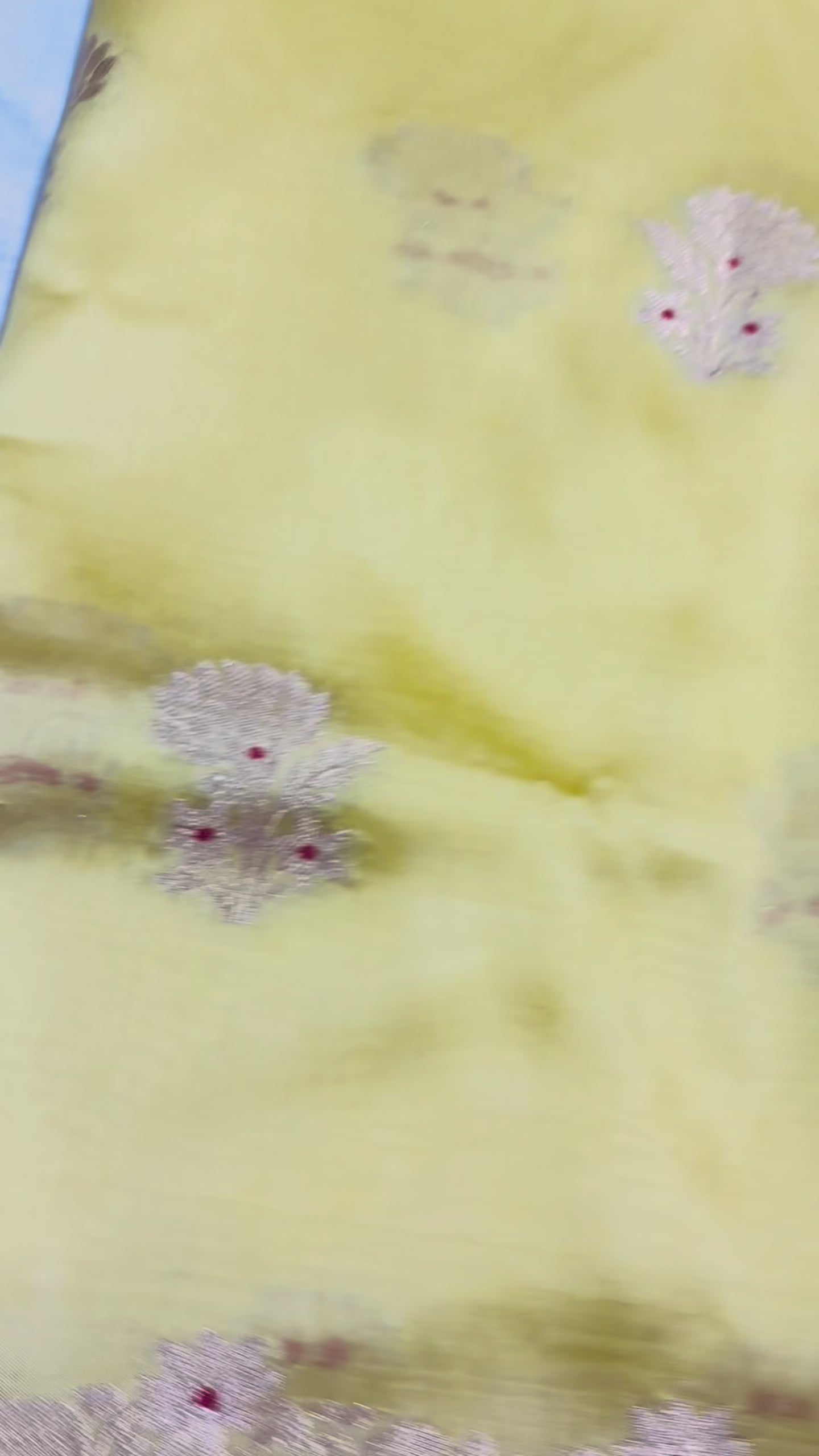 Grace your wardrobe with this Pure Lemon Yellow and Pink Banarasi Chiniya Silk Saree, beautifully detailed with silver floral butta woven all over the body with silver double Zari contrast border, pallu and blouse. The lustrous silk fabric enhances its rich texture, while the intricate motifs reflect traditional artistry.