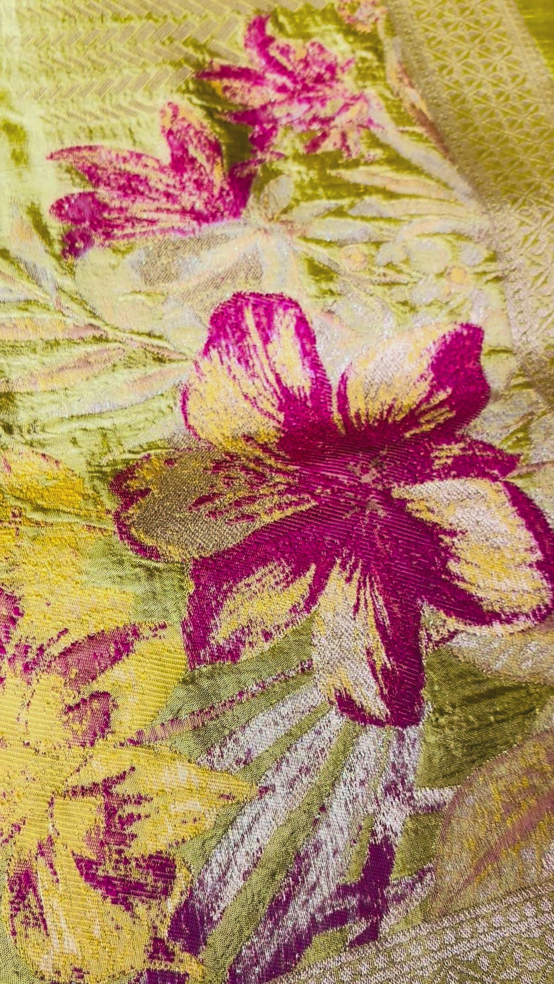 A striking lime green Banarasi silk saree featuring delicate floral buttas in zari, scattered gracefully across the body. The border is intricately woven with contrasting blush pink floral motifs accents, adding a vibrant edge to its traditional charm. Ideal for party occasions and joyful celebrations, this saree is a radiant expression of elegance.