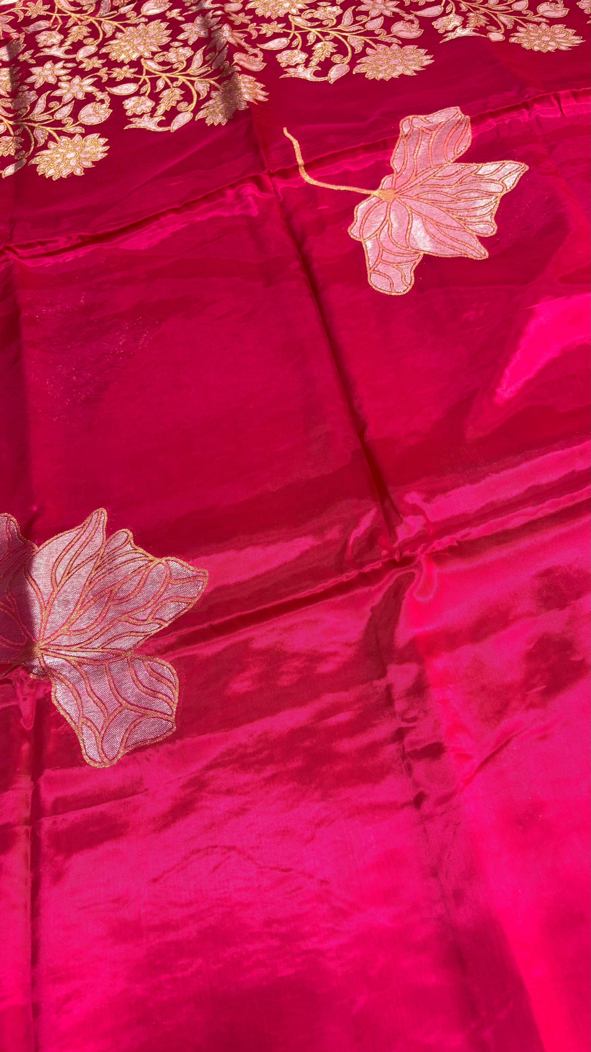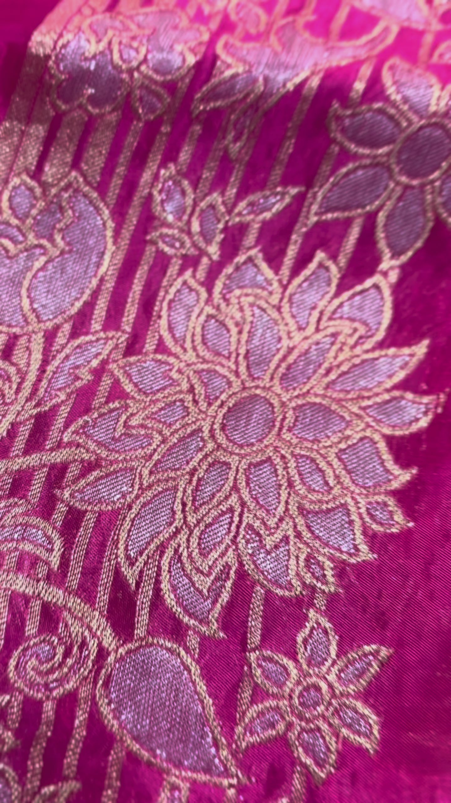 The Metallic Pink Pure Banarasi Mashru Silk Saree is a radiant masterpiece of traditional weaving. Featuring gold leaf and floral patterns across the body, with line gold Zari borders exudes richness and grandeur. The sheen of Mashru silk enhances its elegance, making it perfect for festive and celebratory occasions. A vibrant saree that combines artistry with timeless charm. This fabric has a natural shine and make feather lite drape.