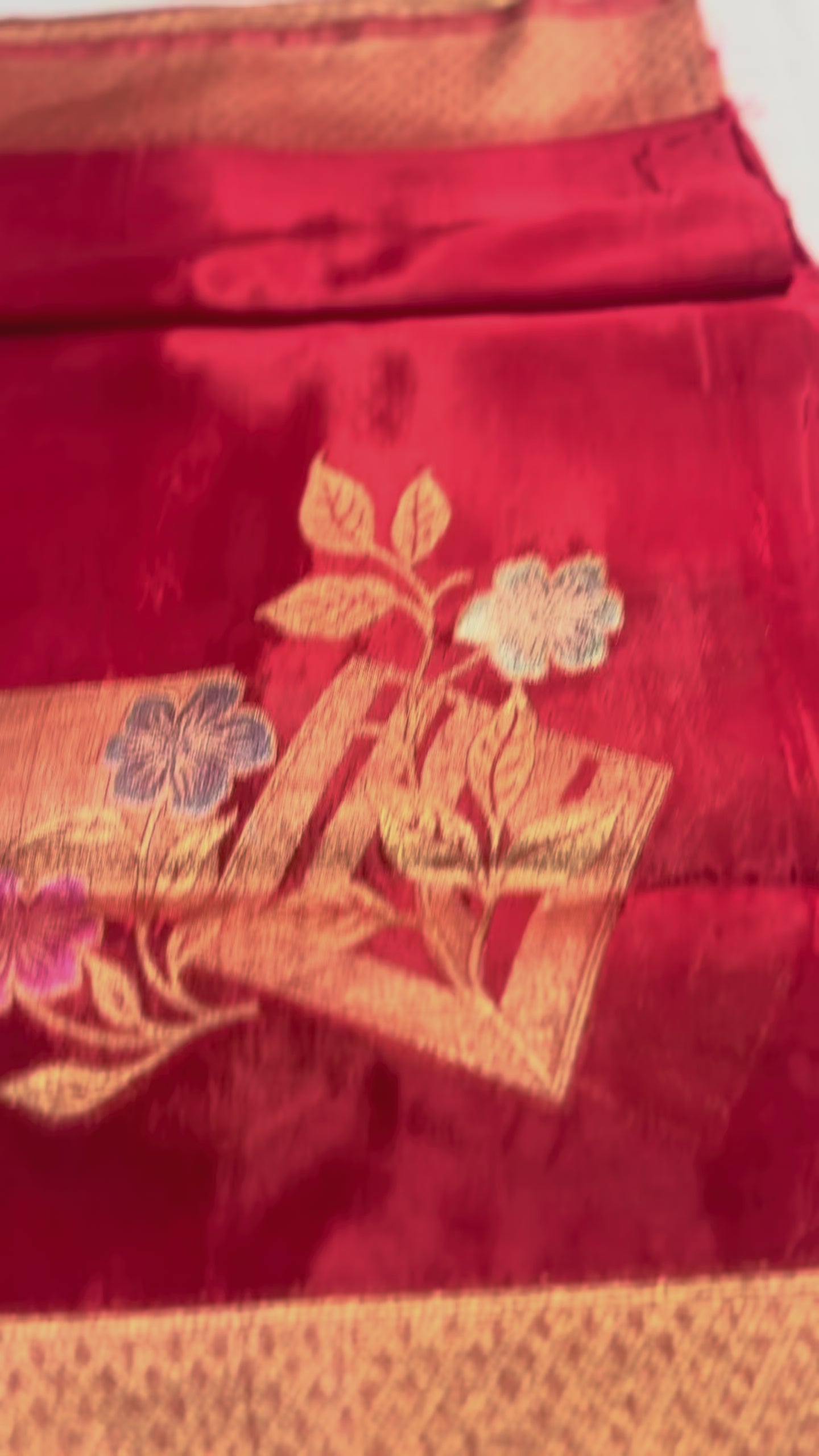 Indulge in the richness of elegance with this Red Pure Banarasi Mashru Silk Saree, meticulously woven with elegant geometrical and flower motifs that reflect the heritage of Varanasi craftsmanship. The luxurious Mashru Silk fabric, known for its smooth texture and subtle sheen, is adorned with a regal Banarasi border in golden zari, adding opulence to every drape.