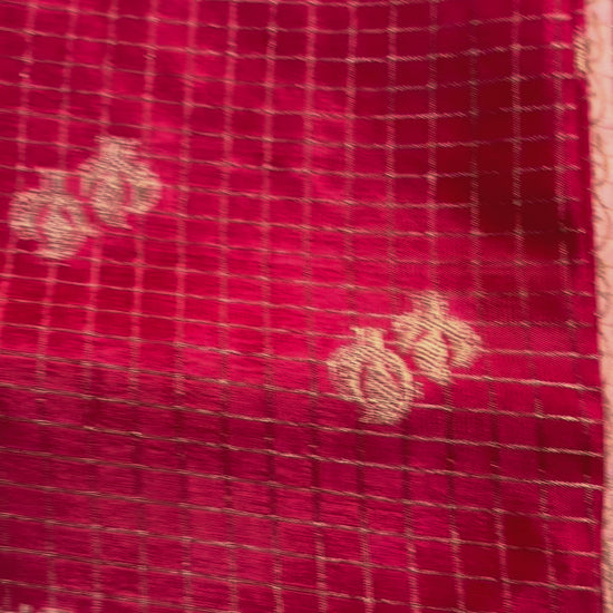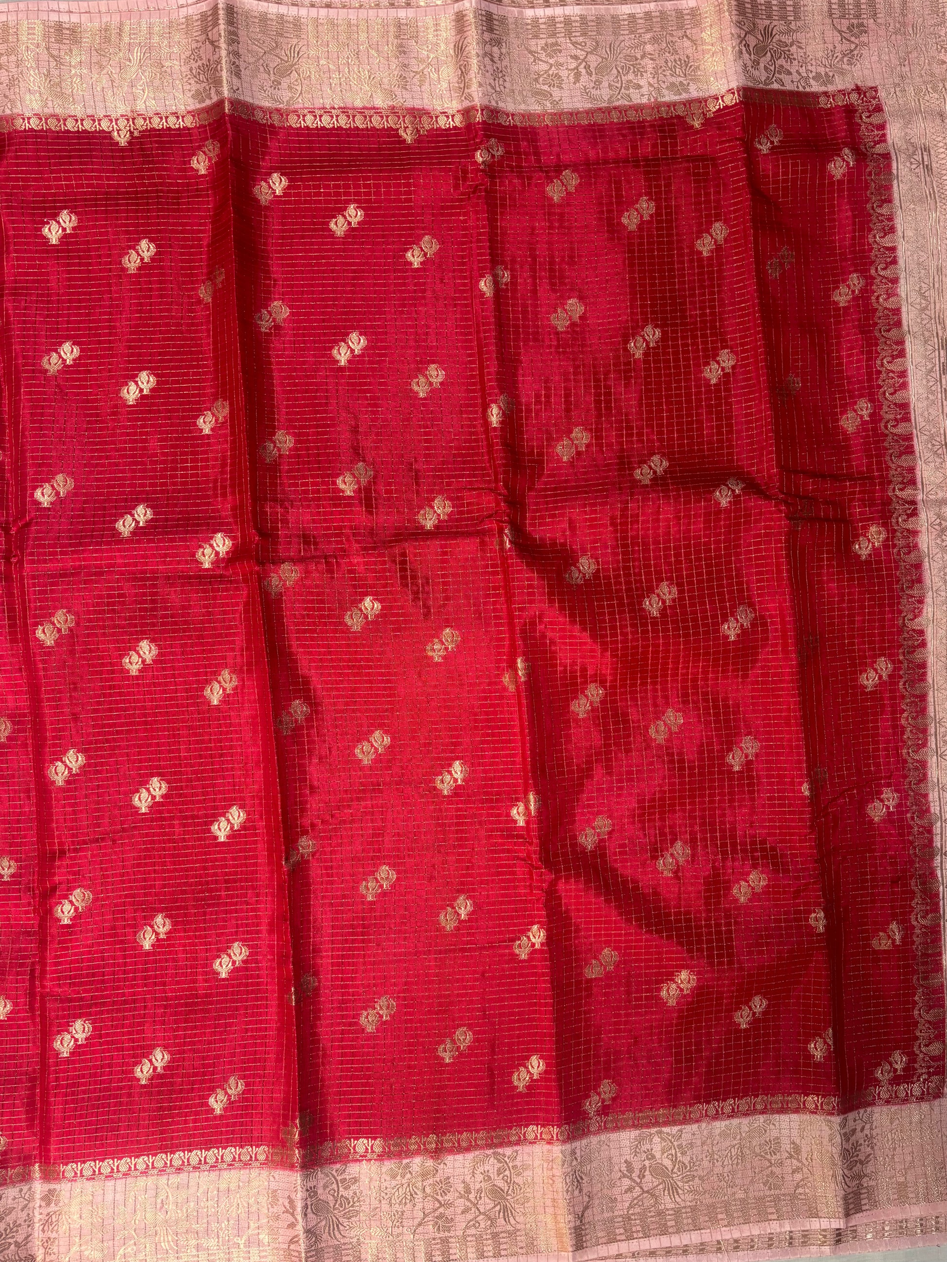 This Red checkered Russian Silk saree has small floral butta design all over the body and drapes beautifully with a soft, smooth texture and a subtle sheen. The golden woven rich Pallu & Border in peach colour makes it more luxurious. Lightweight yet rich in appearance, it offers perfect comfort and sophistication for any occasion.