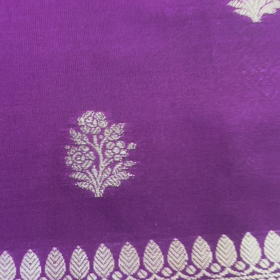 Indulge in the richness of tradition with this Purple Banarasi Mashru Silk Saree with dual shade, meticulously handwoven with small butta motifs and elegant water Zari weaving that reflect the heritage of Varanasi craftsmanship. The luxurious Mashru silk fabric, known for its smooth texture and subtle sheen, is adorned with a regal Banarasi border and brocade Pallu adding opulence to every drape.