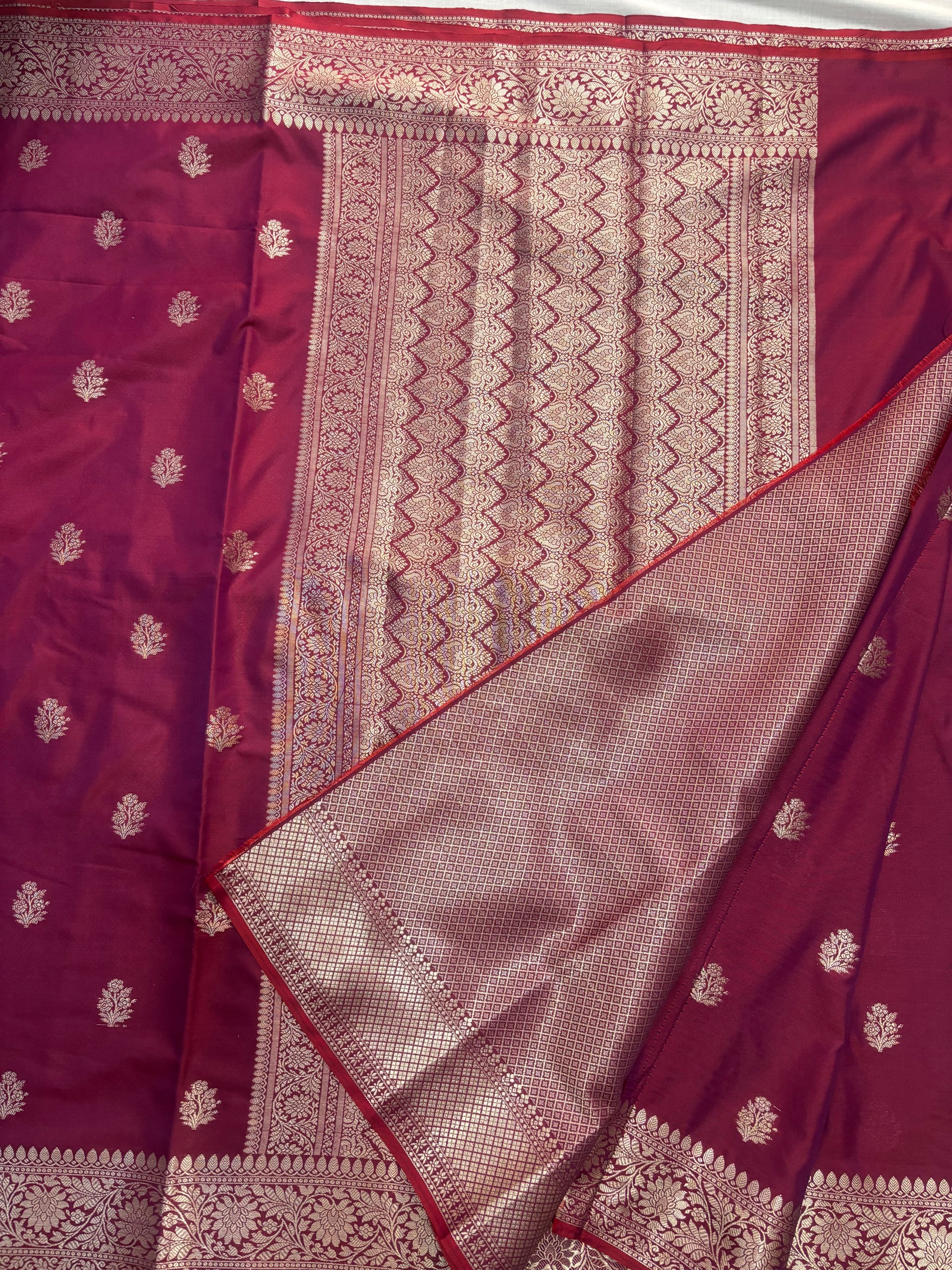 Maroon Banarasi Mashru Silk Saree with dual shade, meticulously handwoven with small butta motifs and elegant water Zari weaving that reflect the heritage of Varanasi craftsmanship. The luxurious Mashru silk fabric, known for its smooth texture and subtle sheen, is adorned with a regal Banarasi border and brocade Pallu adding opulence to every drape.