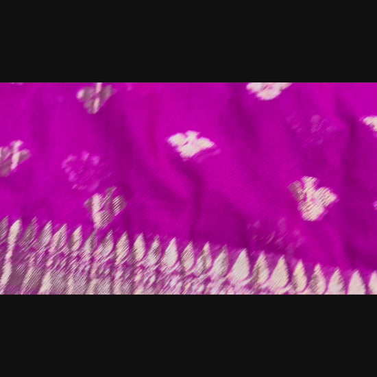 A Banarasi Katan georgette saree is a stunning piece is perfect for draping. The rich Magenta colour adds depth and elegance, while the antique crushed zari work along the border and pallu showcases intricate craftsmanship, featuring traditional motifs that reflect the artistry of Banaras weavers.