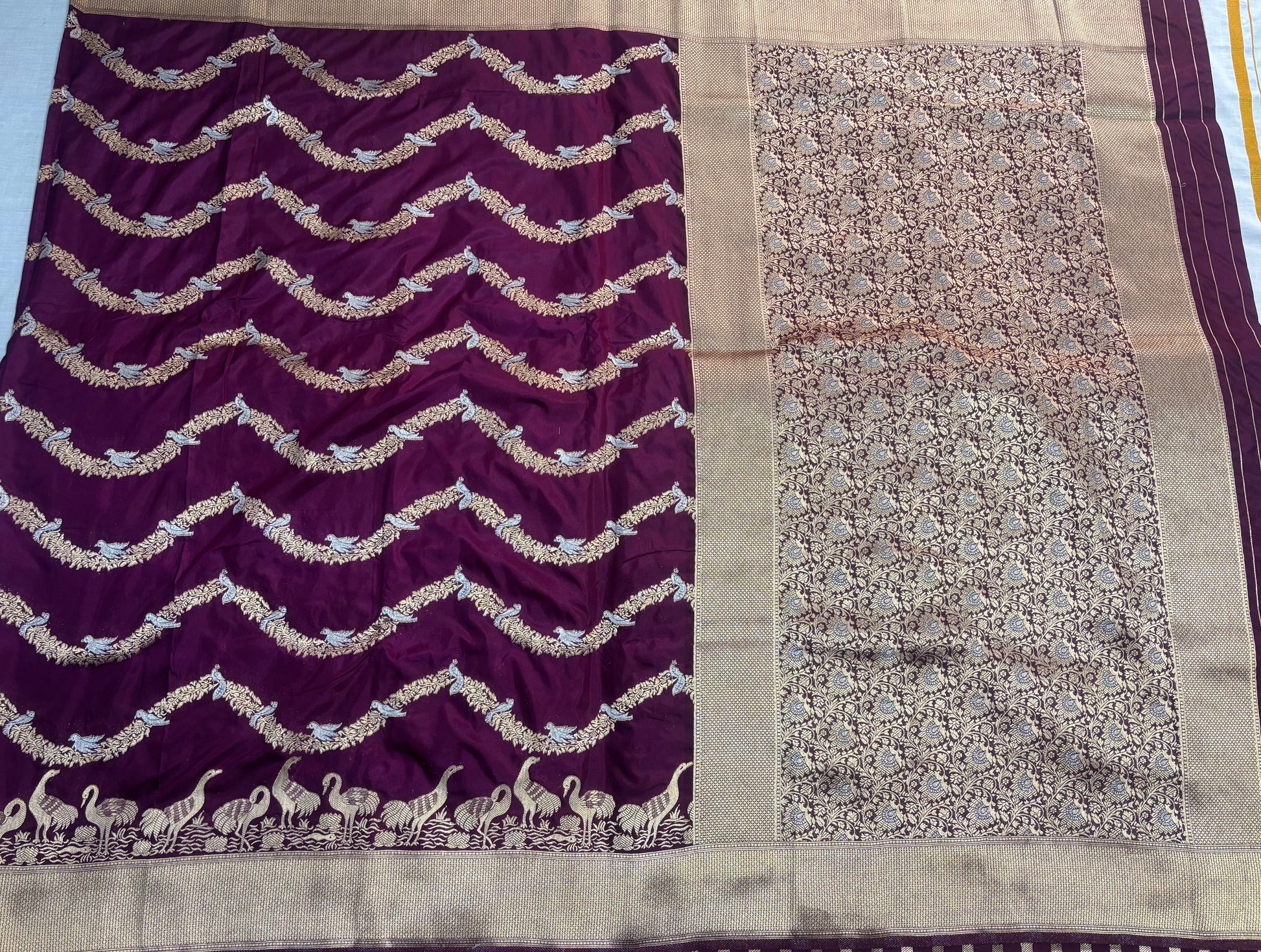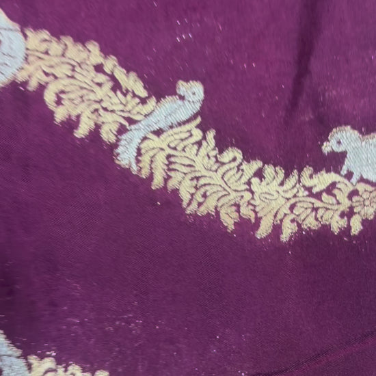 Wine Banarasi Mashru Silk Saree with Gold Wavy lines pattern with Flamingo Motifs Border - Designer Party Wear