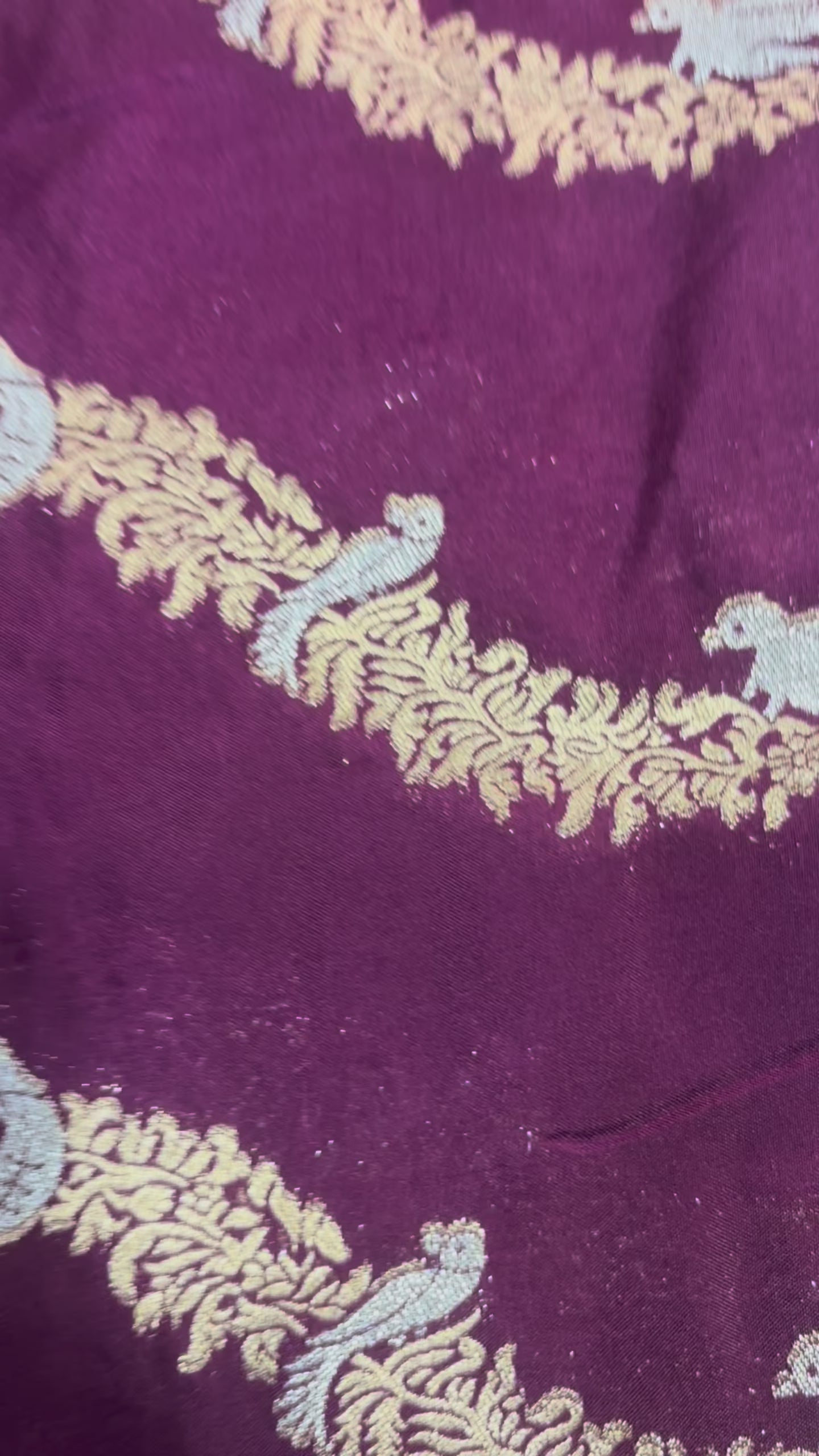 The Wine Banarasi Mashru Silk Saree is a radiant masterpiece of traditional weaving. Featuring gold wavy lines patterns across the body along with traditional Banarasi rich pallu & gold Flamingo borders exudes richness and grandeur.
