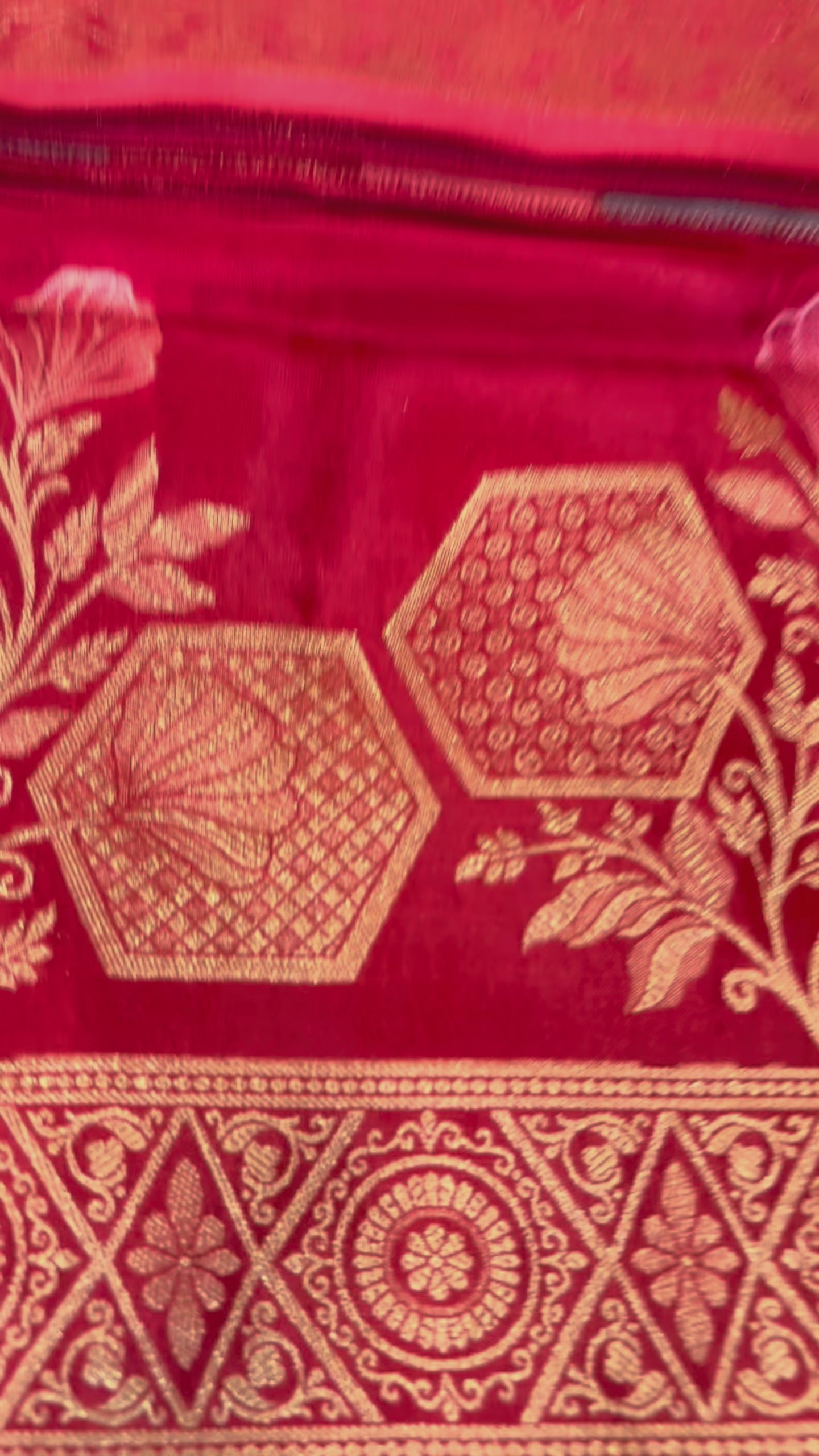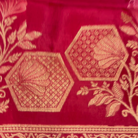 Make a bold and vibrant statement with this stunning Bright Red Soft Mashru Silk Hexagon shaped Weaved Banarasi Saree. The bright red hue is perfectly complemented by the intricate hexagon shaped floral design pallu & Zari border, expertly woven on luxurious Mashru silk fabric. This saree is a perfect blend of traditional Banarasi weaving and modern style, making it ideal for formal events, weddings, and festivals.