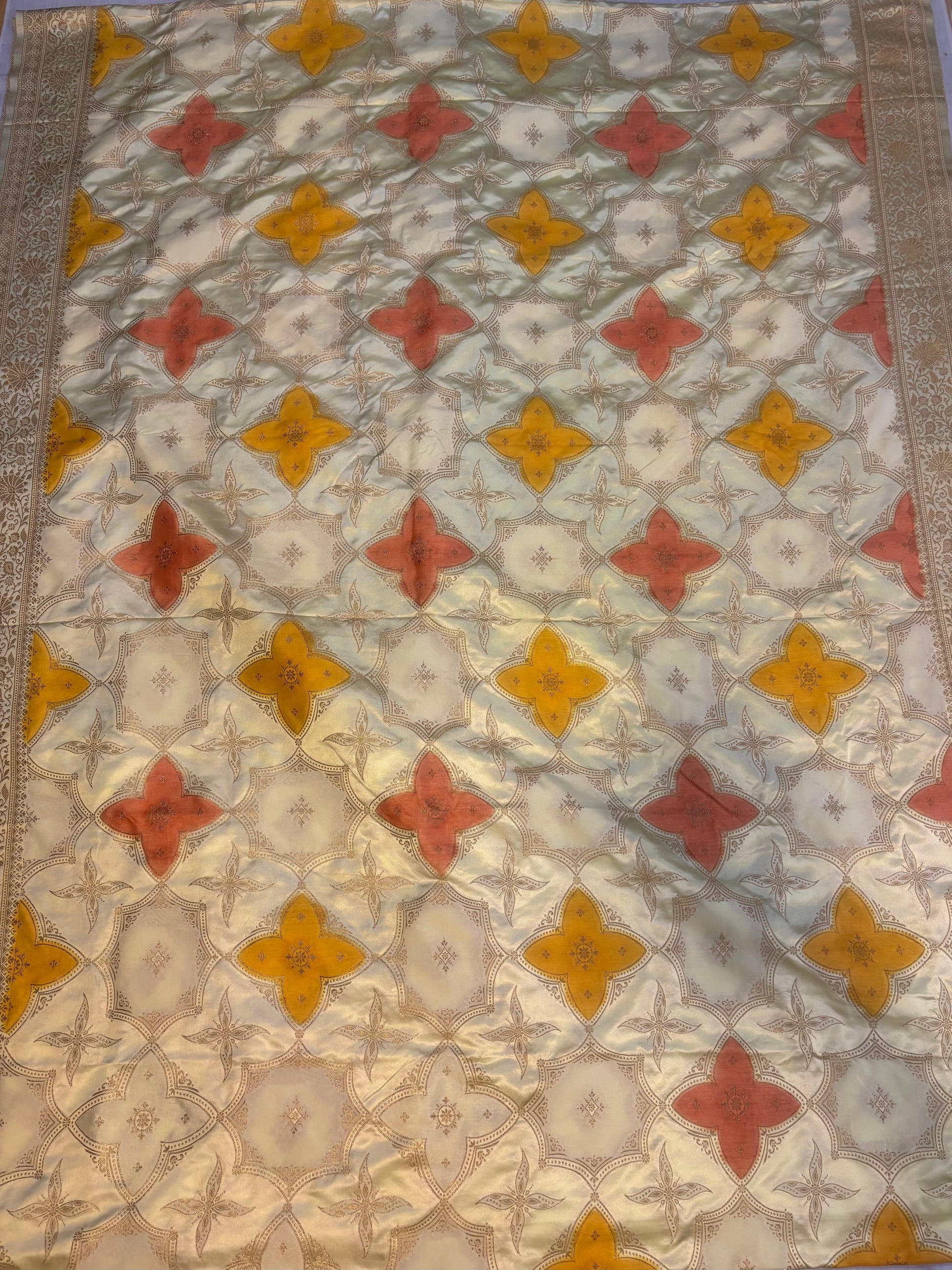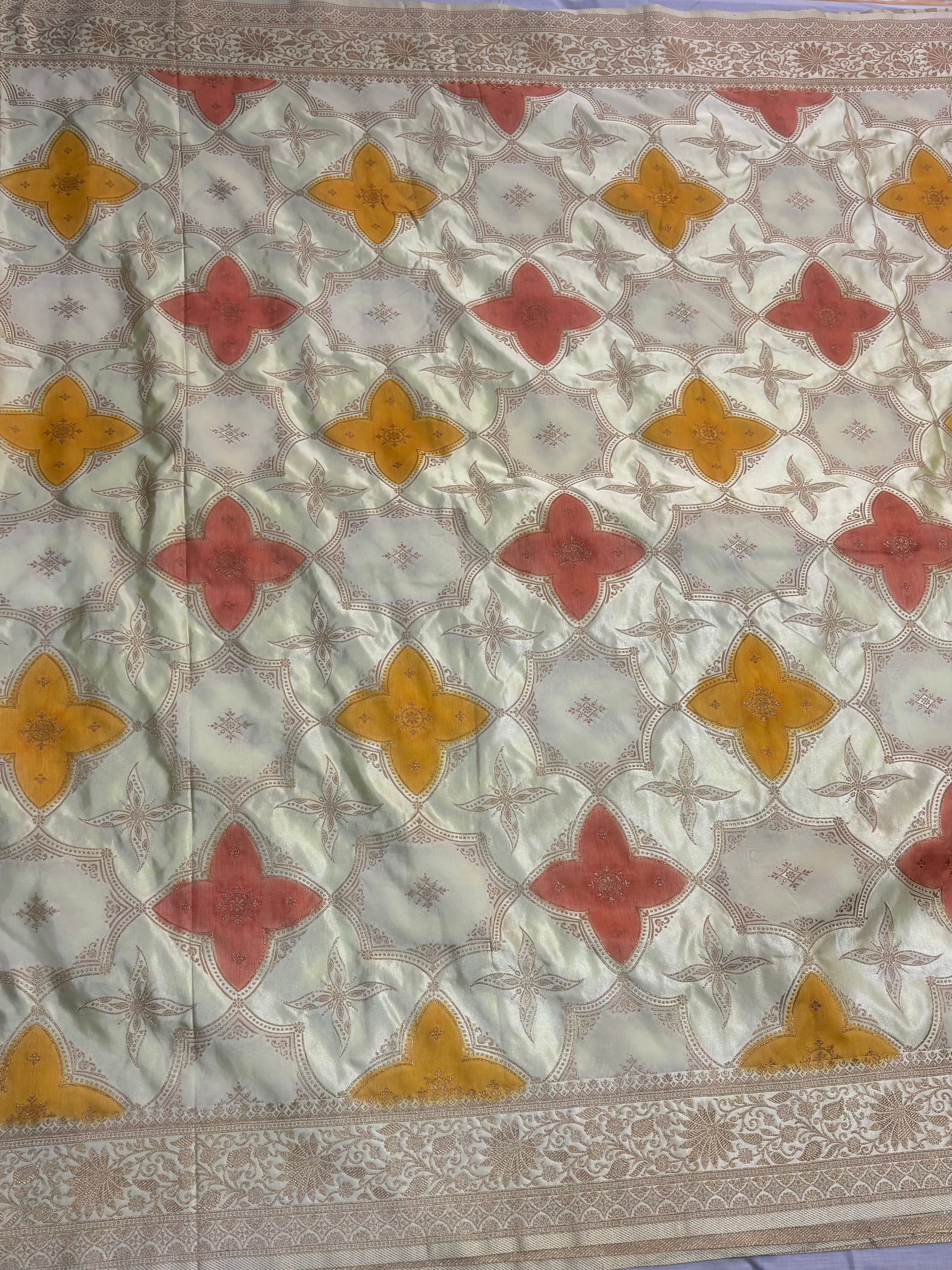 The Lemonn Yellow Banarasi Mashru Silk Saree is a radiant masterpiece of Rangkat concept weaving. Featuring silver geometrical shaped Yellow & brown patterns across the body along with traditional Banarasi rich pallu & gold zari borders exudes richness and grandeur.