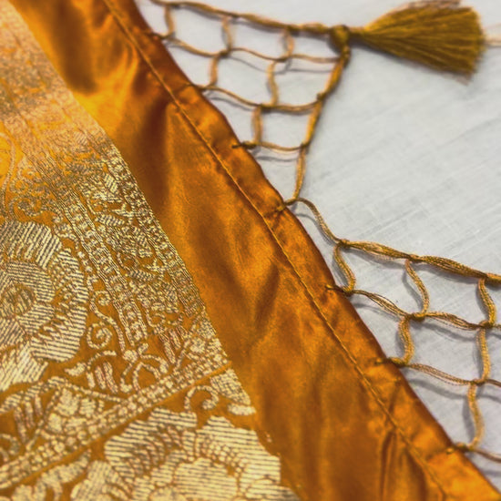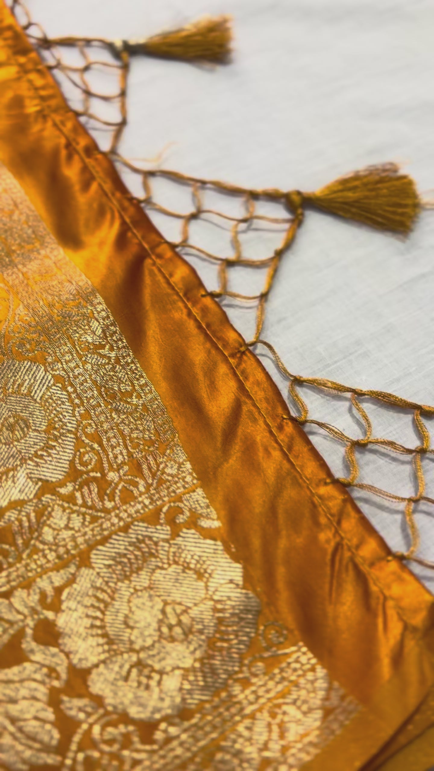 Embrace warmth and elegance with this exquisite Mustard Yellow Banarasi Mashru Silk Saree. Intricate Rose floral patterns dance across the vibrant fabric, creating a stunning visual effect.