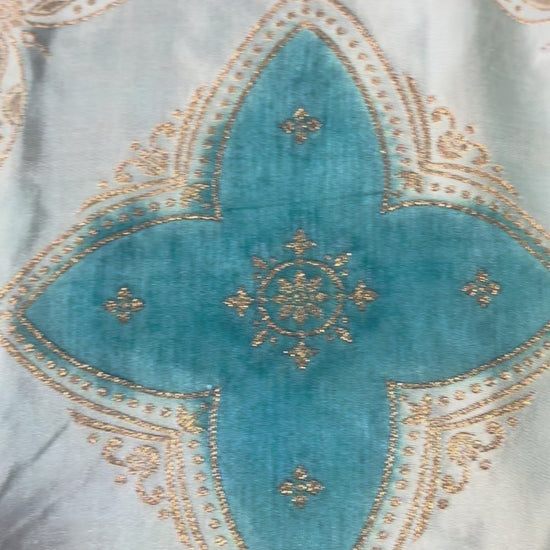 The Sky Blue Banarasi Mashru Silk Saree is a radiant masterpiece of Rangkat concept weaving. Featuring silver geometrical shaped Green & Blue patterns across the body along with traditional Banarasi rich pallu & gold zari borders exudes richness and grandeur.